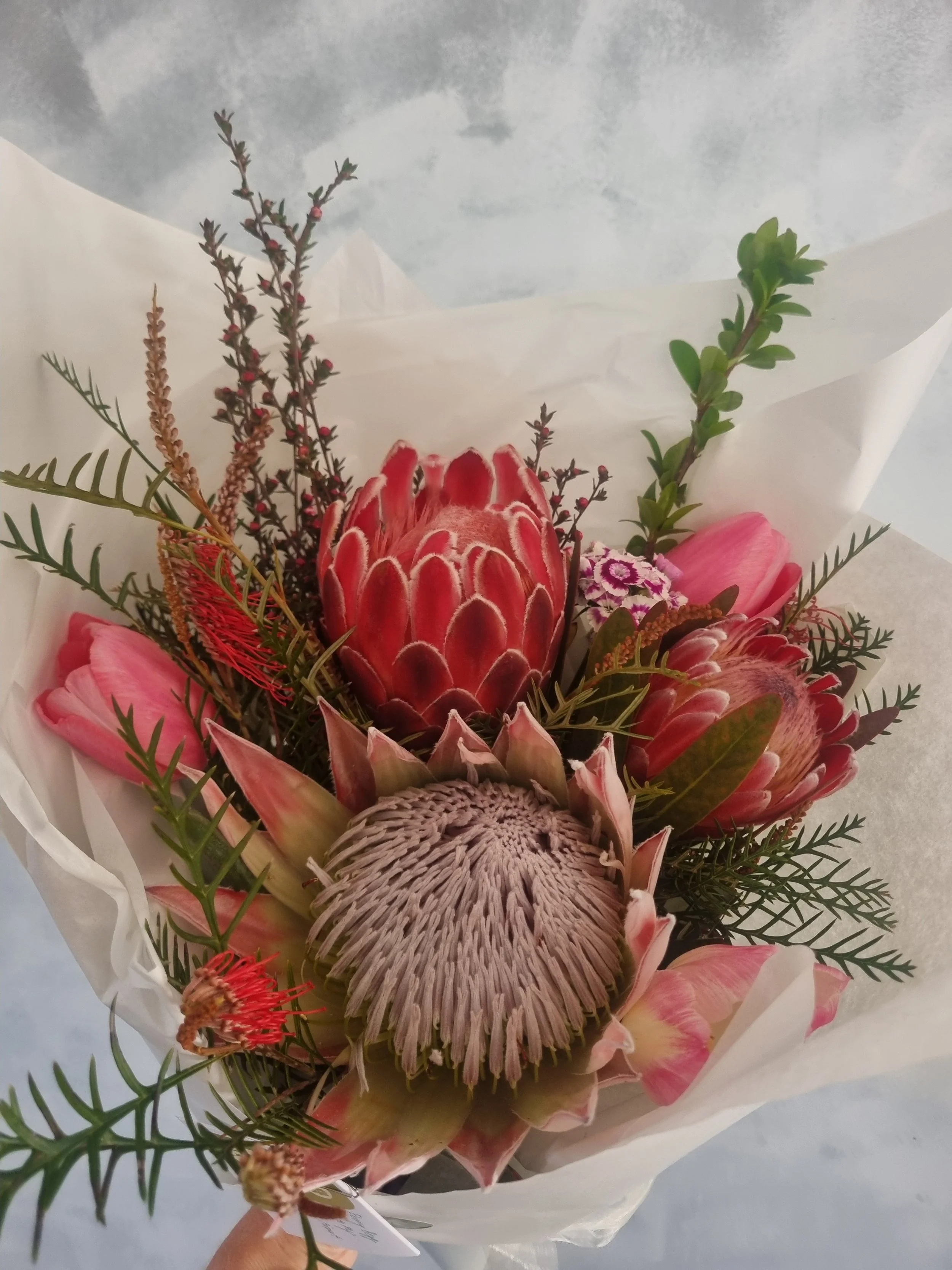 A mixture of blooms to compliment our locally grown protea. $10 from each bouquet goes straight to our friends at Nelson Tasman Hospice. Please note that the variety of protea will vary as the season goes on and may include white, lemon, red or pink protea. First picture shown is extravagant, second picture is medium.