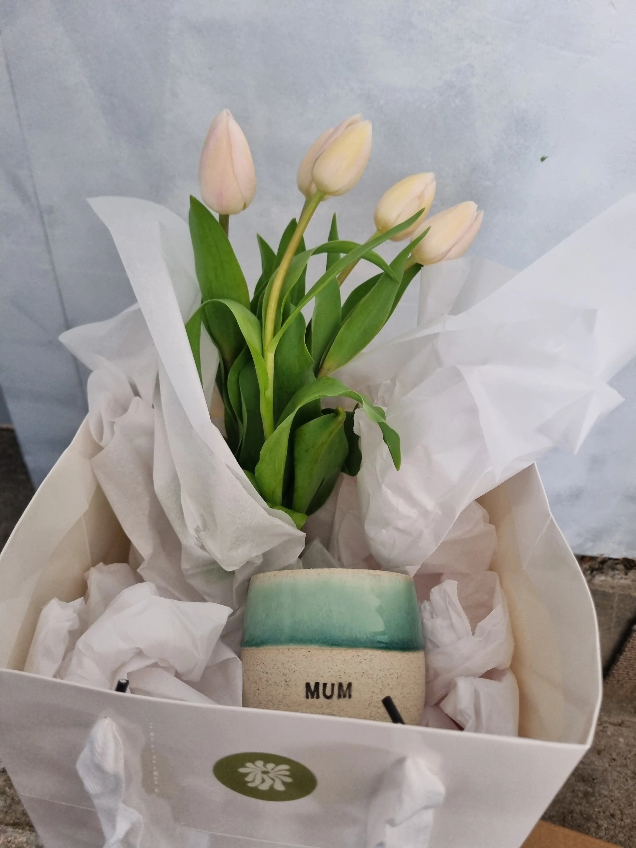 A gorgeous bunch of tulips (please note the colour will vary depending on what is in stock) and a “MUM” tumbler from Francis Pottery. This gift comes presented in our white box bag x